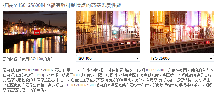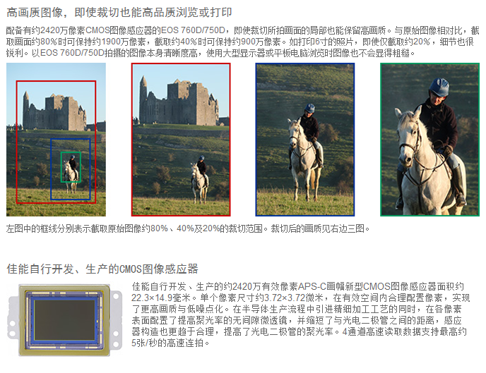 EOS 760D配备了有效像素约2420万的APS-C画幅CMOS图像感应器,直至被摄体细节都可清晰成像。DIGIC 6数字影像处理器不仅可高速处理图像,还通过全新算法实现了更低噪点的高画质。常用感光度范围为ISO 100-12800,并可扩展至ISO 25600,其高感光度性能可支持多种场景的拍摄。