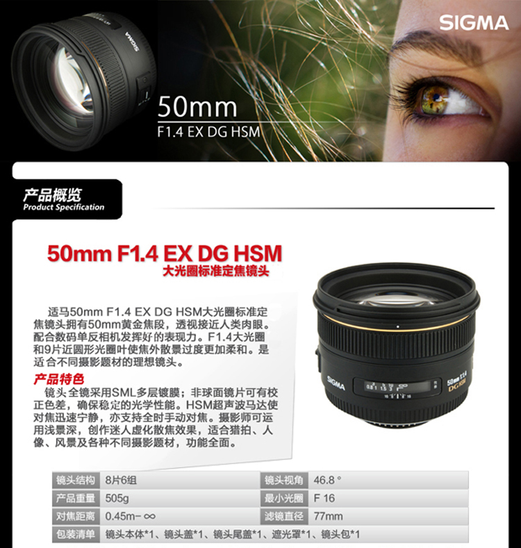• 特性:全新设计50mmF1.4大光圈标准镜,适配全片幅24x36mm及APS-C数码单镜反光相机